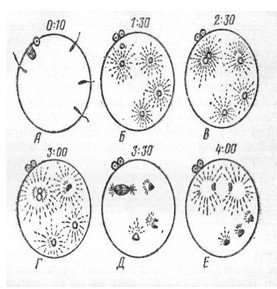 полушарие и дегенерируют. Цифры над изображением яиц - время после проникновения