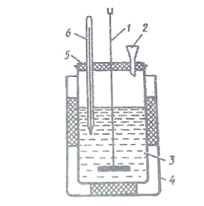тремя отверстиями: для воронки (2), мешалки (1) и термометра (6).