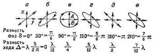 Примеры различных поляризаций светового луча при различных разностях фаз между взаимно перпендикулярными компонентами Ех и Еу, Плоскость рисунков перпендикулярна направлению распространения света; (а) и (д) - линейные поляризации; (в) - круговая поляризация; (б), (г) и (е) - эллиптические поляризации. Рисунки соответствуют положительным разностям фаз 6 (опережению вертикальных колебаний по сравнению с горизонтальными). l - длина волны света.