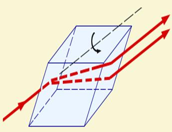 Прохождение света через кристалл исландского шпата (двойное лучепреломление). Если кристалл поворачивать относительно направления первоначального луча, то поворачиваются оба луча, прошедшие через кристалл.