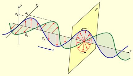 Поперечность электромагнитных волн лишает волну осевой симметрии относительно направления распространения из-за наличия выделенных направлений (вектора Е - напряжённости электрического поля и вектора Н - напряжённости магнитного поля) в плоскости, перпендикулярной направлению распространения. Поскольку векторы Е и Н электромагнитной волны перпендикулярны друг другу, для полного описания состояния поляризации светового пучка требуется знание поведения лишь одного из них. Обычно для этой цели выбирается вектор Е.