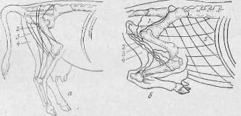 Двуглавая мышца бедра у коров, а у кобыл и полусухожильная, начинаясь от первых крестцовых и последних хвостовых позвонков, не допускают при стоячем положении животного отклонения конца крестцовой кости кверху и, следовательно, расширения задней части полости таза в сторону. Кроме того, все мышцы, прикрепляющиеся к седалищному бугру, оттягивают его вниз, в результате чего поднимается вверх передний край лонных костей, что затрудняет вход плода в таз. Указанные факторы свидетельствуют о том, что стоячее положение роженицы при патологических родах является неблагоприятным,