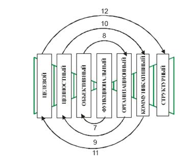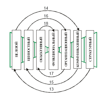 . Формируются и развиваются ресурсонесущие связи как внутри организации, так и во внешней среде с поставщиками, партнерами, клиентами и конкурентами, относительно идеи миссии организации. 11. В зависимости от качества коммуникативных связей определяются целевые требования к предлагаемым продуктам (услугам), посредством которых реализуется миссия, организации, 12. Предложение инновационного использования продукта (услуг), которое способствует реализации миссии организации. Затем рассмотрим стадию управления в горизонтальных обратных связях (рис. 6). На данной стадии определяем обратную связь от рынка и качество позиционирования организации на рынке. Обратная связь определяет, на сколько миссия организации актуальна и реализуется во внешней среде. . Изменения целевых требований к продуктам в зависимости от масштаба воздействия организации на сегмент рынка и качества развития потребителя посредством предлагаемых продуктов (услуг), . Коррекция поведения сотрудников организации в ресурсонесущих связях