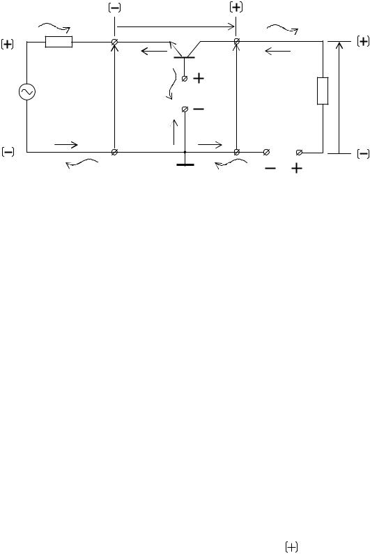 Постоянные токи I0Э, I0K, I0Б, протекающие в схеме (см. рис. 3.7), определяются типом транзистора и полярностью источников Е0Б и Е0К. Постоянный ток базы I0Б протекает от +Е0Б через базу, эмиттер, источник сигнала Е1, R1, к -Е0Б. Постоянный ток коллектора I0К течет от +E0К через сопротивление R2 участок коллектор–эмиттер транзистора, источник сигнала Е1, R1 к –E0К. Мгновенные значения переменных токов задаются источником сигнала Е1. Переменный ток эмиттера iЭ течёт от (+)Е1 через R1 к эмиттеру. В эмиттере этот ток разветвляется на базовую iБ и коллекторную iK составляющие. Базовая составляющая протекает от эмиттера к базе, далее через Е0Б к (–)Е1. Коллекторная часть тока течёт от эмиттера в коллектор, далее через сопротивление R2, источник Е0К к (–)Е1. Коллекторный ток, протекая по сопротивлению R2, создаёт на нём падение напряжения u2 c плюсом вверху и минусом внизу. Сравнивая полярности напряжения u2 и ЭДС Е1, делаем вывод, что схема с ОБ не изменяет полярность усиливаемого сигнала.