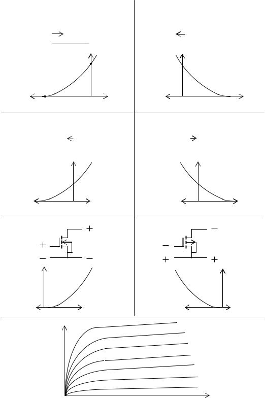 Для всего большого количества разнообразных полевых транзисторов (ПТ) характерно наличие трёх основных электродов, сопоставимых с соответствующими электродами биполярного транзистора (исток-эмиттер, затвор-база, сток-коллектор). Основные типы ПТ, отличающиеся технологией изготовления, полярностью напряжения питания и параметрами, а также их входные и выходные характеристики представлены на рис. 3.16, а – ж. Основное деление полевых транзисторов осуществляется по типу проводимости канала. Различают ПТ с каналом n-типа и р-типа. Тип канала определяет полярность напряжения питания цепи стока.