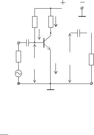 Как известно, активные элементы не могут работать без внешнего источника, чью энергию они преобразовывают в энергию полезного сигнала. Поэтому даже в отсутствие сигнала через активные элементы протекают токи, а на их электродах существуют вполне определённые напряжения. Эти токи и напряжения задают рабочую точку активного элемента. Таким образом, рабочая точка описывает состояние активного элемента при отсутствии сигнала. Обычно все постоянные напряжения измеряются относительно земли. Схема каскада на биполярном транзисторе, представленная на рис. 3.22, позволяет считать, что рабочая точка описывается следующими параметрами: I0Б, U0Б, I0К, U0К.