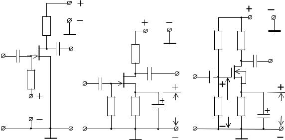 схем (см. рис. 3.40, б, в) не отличается от принципа действия схемы эмиттерной стабилизации. В этих схемах за счет сопротивлений RИ создается отрицательная обратная связь по постоянному и переменному токам, последовательная по входу. Отрицательная обратная связь по постоянному току, как и в случае эмиттерной стабилизации, стабилизирует положение рабочей точки каскада на полевом транзисторе. Отрицательная обратная связь по переменному току уменьшает коэффициент усиления каскада. Для устранения ООС по переменной составляющей резистор в цепи истока RИ шунтируют конденсатором достаточно большой емкости СИ.