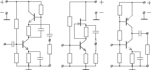 понять на примере первой схемы. При указанной на рис. 4.39, а полярности сигнала ток коллектора транзистора VT1 увеличивается, одновременно растет падение напряжения на сопротивлении R3. Это напряжение воздействует через конденсатор С2 на базу транзистора VT2 и пытается его запереть. Сопротивление транзистора VT2 возрастает, и нагрузочная прямая по постоянному току для транзистора VT1 становится более пологой. Рабочая точка, а вместе с ней и нагрузочная прямая по переменному току (линия АБ) сдвигаются в положение 2 (рис. 4.38), и напряжение на коллекторе VT1 становится минимальным. В следующие полпериода ток через VT1 уменьшается, транзистор VT2 приоткрывается, и нагрузочная прямая сдвигается к точке 3. В результате переменное напряжение на коллекторе VT2 растет и достигает величины UKmax. Схема (см. рис. 4.39, б) с полевым транзистором в качестве динамической нагрузки имеет аналогичный принцип действия.