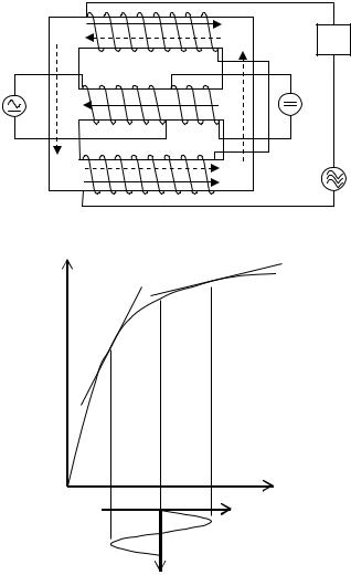 На рис. 6.7, б приведен график зависимости индукции В в сердечнике от напряженности магнитного поля Н, позволяющий облегчить понимание принципа работы магнитного усилителя. Под воздействием тока, задаваемого напряжением Е0, рабочая точка выводится на середину нелинейного участка кривой намагничивания. Входной сигнал возбуждает ток в управляющей обмотке, под влиянием которого изменяется напряженность магнитного поля и соответственно изменяется магнитная индукция в сердечнике. Магнитная проницаемость сердечника µ пропорциональна скорости изменения магнитной индукции и определяется в каждой точке кривой производной dB/dH. Индуктивность катушки с магнитным сердечником непосредственно зависит от его магнитной проницаемости. Индуктивность и соответственно сопротивление для высоко-