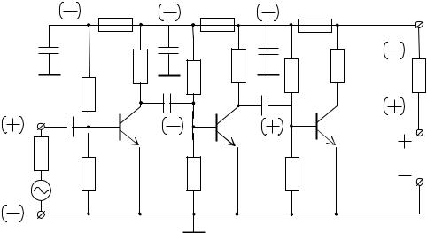 Зададимся полярностью мгновенного значения сигнала на входе и, учитывая переворот фазы сигнала каждым из каскадов, определим направление коллекторного тока последнего транзистора. Этот ток протекает по выходному контуру против часовой стрелки и создает падение напряжения UП на внутреннем сопротивлении источника питания с плюсом внизу и минусом вверху. Явление паразитной обратной связи заключается в том, что напряжение UП оказывается приложенным через базовые цепи к базам предыдущих транзисторов. При этом для одних транзисторов рассматриваемая обратная связь получается отрицательной, а для других – положительной. Как правило, положительной обратной связи оказывается достаточно для самовозбуждения части усилителя, попадающей в данную петлю ОС. Примером является самовозбуждение усилителей низкой частоты в отдельных радиоприемниках карманного формата при заметном разряде питающих батарей. При разряде батареи возрастает ее внутреннее сопротивление R0, и в этом случае попытка увеличить громкость приводит к увеличению тока выходного каскада, растет падение напряжения на R0 и увеличивается глубина паразитной обратной связи, что и приводит к самовозбуждению.