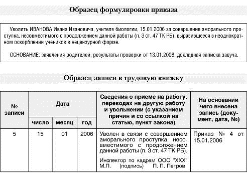 аморального проступка, несовместимого с продолжением данной работы (п. 3 ст. 47