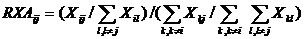 Індекс RXA визначається як відношення частки країни у світовому експорті певного товару до частки даної країни у світовому експорті усіх інших товарів. Специфічною рисою даного вимірника є те, що світовий експорт товару завжди визначається як сума експорту усіх країн, крім тієї, що досліджується. Аналогічно із суми світового експорту виключається значення експорту того товару, що є предметом дослідження. Це дозволяє уникнути подвійного рахунку, коли експорт країни (товару) є і чисельником, і складовою знаменника. Цей аспект особливо доречний, якщо країна має суттєву частку у світовій торгівлі, і/чи досліджуваний товар становить значну частину світового експорту. [42, с. 330]
