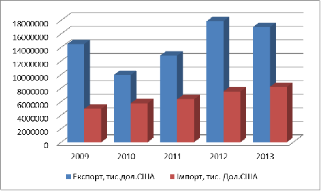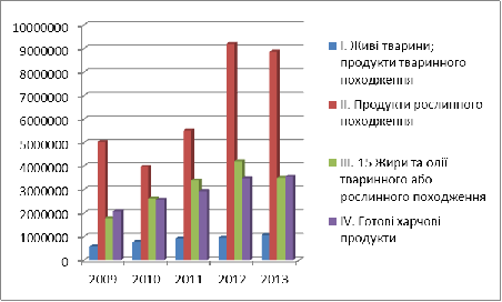Як показує нам рисунок експорт харчової продукції переважає імпорт. Загальна тенденція експорту має мінливий характер, тобто у 2009 р. обсяги експорту продовольчої продукції були значнішими, ніж у 2010 р. та 2011 р., така динаміка обумовлена світовою фінансовою кризою. Проте в 2012 р. Україна експортувала продовольчої продукції на 5076488 тис.дол.США більше, ніж у 2011 р. В 2013 р. обсяги експорту дещо скоротилися у порівнянні з 2012 р. і склали 17024350,2 тис.дол.США. [36]
