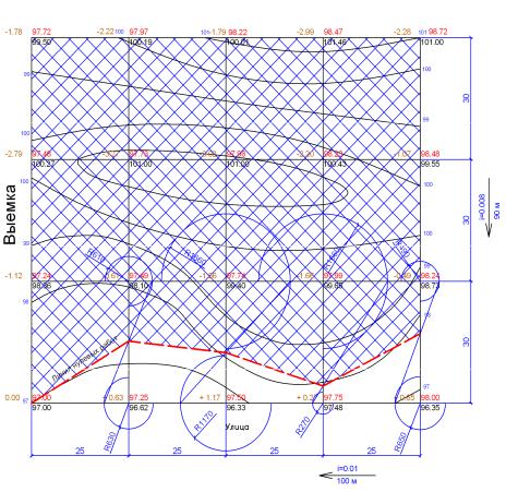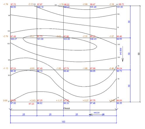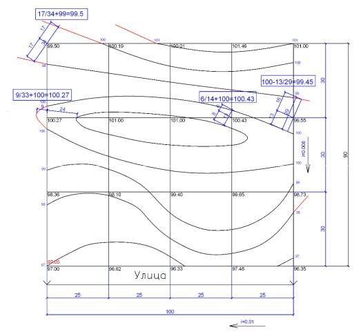 Уклоны могут быть заданы разными способами. Если уклоны задаются стрелками, параллельными координатной сетке (направление стрелки указывает падение уклона) и цифрой (доли единицы, например I=0.002), то от известной планировочной отметки (97.0) угла улицы легко вычисляется красная отметка в необходимой точке. Умножаем расстояние на уклон, получаем разницу в отметках . Прибавляя (или вычитая в зависимости от направления уклона), полученную величину к исходной отметке, определяем красную отметку. Сначала эта операция проделывается по одной из сторон площадки, а затем по параллельным ей линиям сетки. Если задан косой уклон, то для вычисления отметок он раскладывается на вертикальную и горизонтальную составляющие. В некоторых заданиях могут быть заданы существующие отметки улицы по углам участка, тогда исходя из этих отметок необходимо определить уклон по «УЛИЦЕ». Полученные «красные» отметки проставляются в правом верхнем углу перекрестия.