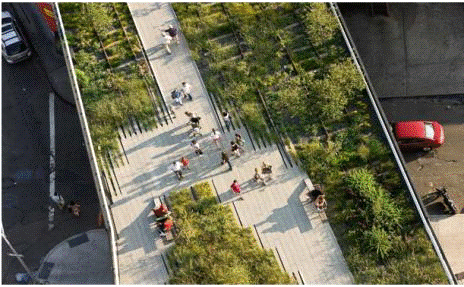 “The High Line” - парк на ранее заброшенной железнодорожной эстакаде в историческом районе Манхэттена - общественное пространство, ставшее драйвером развития пришедшей в упадок территории и новым брендом Нью-Йорка. Парк “the High Line” - успешный пример освежающего действия инновационного дизайна общественных пространств на городскую среду.