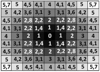 относительно центра расчётной ячейки: чем ближе к центру, тем больше вес. Как