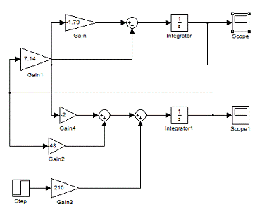 Для построения Simulink-модели системы (14) нам необходимы следующие библиотеки: , содержащую блок интегрирования integrator; , содержащую блоки масштабирования и суммирования gain и sum; , содержащую блоки виртуальных регистраторов scope:, содержащую блоки единичного скачка step.
