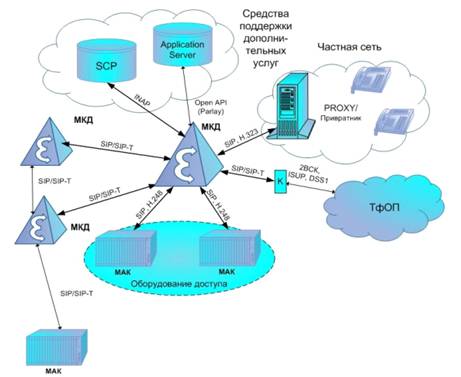 В каждый ТК включаются мультисервисные коммутаторы доступа (МКД), который, оперируя терминологией ТФОП, представляет собой оконечную (опорную) станцию местной телефонной сети. На рисунке показана звездообразная топология связи МКД и ТК, но на уровне транспортной сети (третий раздел настоящего РТМ) организуются два независимых (в смысле надежности) пути передачи информации между этими узлами коммутации пакетов. Все ТК связаны с магистральным коммутатором (МК), который обеспечивает выход в сети дальней связи для междугородных и международных соединений, то есть является аналогом АМТС.