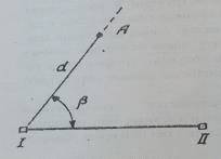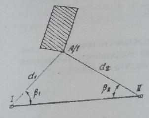 )Способ прямой угловой засечки применяют при выносе на местность точек, значительно удаленных от пунктов геодезической сети, а также в тех случаях, когда местность неудобная для производства линейных измерений лентами или рулетками. Сущность способа заключается в определении, а затем построении на местности углов β1, β2 (рис.3), образованных опорной стороной- II и направлениями I-А/1 и II - А/1. Определяемая точка А/1 получается как пересечение направлений, образованных проектными углами β1 и β2, Значения углов β1 и β2 вычисляют как разность дирекционных углов соответствующих сторон треугольника Ι-А/1-ΙΙ. Дирекционные углы сторон получают решением обратной задачи по координатам точек.