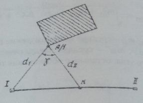 )Способ линейных засечек (рис.5) применяют при вынесении на местность проектных точек, близко расположенных от опорных геодезических пунктов. Положение проектной точки А/1 получают пересечением дуг окружностей с радиусом d1 и d2, центрами которых служат геодезические пункты. Длины d1 и d2 получают из решения обратной задачи по координатам пунктов, при этом d1, и d2 не должны превышать длины мерного прибора (ленты или рулетки). При этом могут пользоваться не только пункты геодезической основы, но и створные точки (например, точка К), расположенные на твердых сторонах.