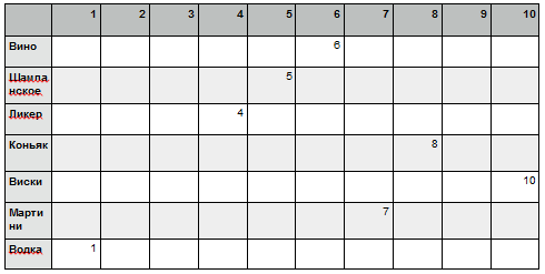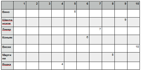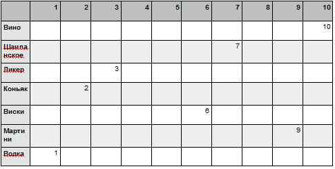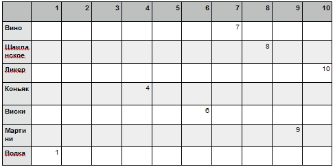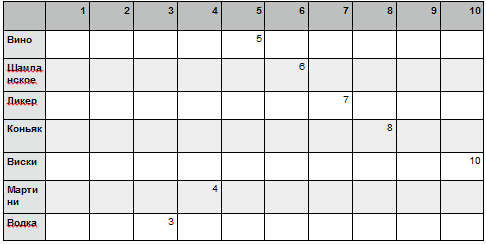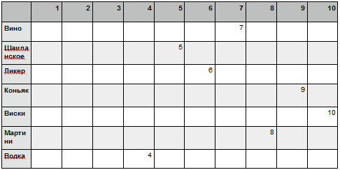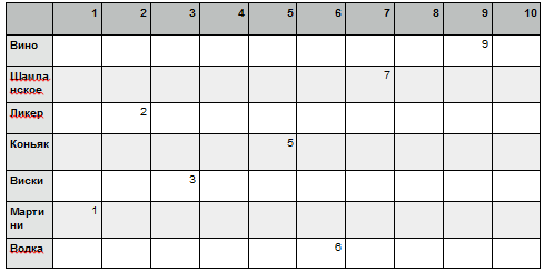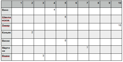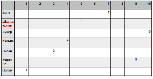 Значение шкал от 1 до 10. Где 1 это наименее приятный вам спиртной напиток,10 любимый напиток.