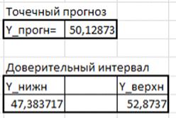 Вычислим точечный прогноз путем подстановки найденных значений в уравнение:(х1, х5) = 0.4971*117,39 - 0,4286 *19,2=50,129