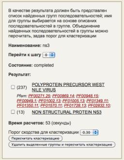 На странице с результатом мы видим несколько кластеров, щелкнув на кластер вы увидите весь список последовательностей (точное количество приведено вначале строки в круглых скобках). Последовательности разбиваются на кластеры в соответствии с заданным вами порогом кластеризации, чем выше порог тем больше кластеров вы увидите. Анализировать последовательности таким способом удобно, потому как взгляду представляется более широкий охват последовательностей. Кроме того, можно воспользоваться приведенными на странице идентификаторами специализированной базы белковых семейств Pfam и узнать принадлежность искомого вами белка к какому-либо белковому семейству.