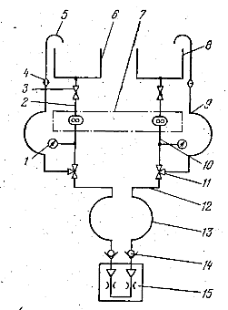 - фильтр; 6.8 - баки расходные; 7 - дозирующее устройство; 9, 13 - гибкие