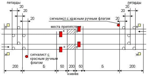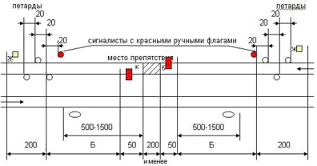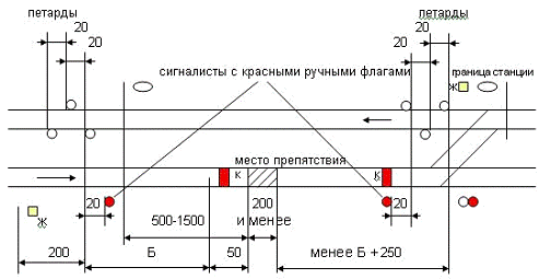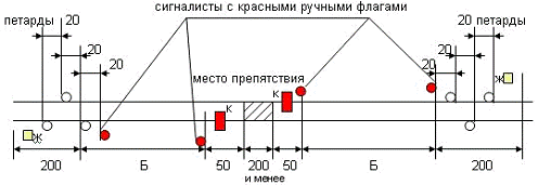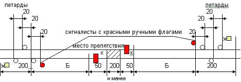 Переносные сигналы уменьшения скорости и петарды должны находиться под охраной сигналистов, стоящих с ручными красными сигналами в 20м от первой петарды в сторону места работ.