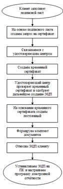 Для того, чтобы пользоваться услугами операторы связи необходимо получить сертификат ЭЦП у данного оператора связи и зарегистрироваться на его сайте. Далее на компьютере налогоплательщика устанавливается одна из программ электронной отчетности, производится ее настройка, устанавливается связь с оператором и далее можно осуществлять обмен отчетами с различными налоговыми органами. Для облегчения этих процедур различные компьютерные фирмы оказывают свои услуги по организации этих процессов. Одной из таких фирм является ООО "Компьютерный аудит", где я работаю. Наши фирма берет на себя решение вопросов регистрации клиента у оператора связи, получения сертификатов ЭЦП, установки и настройки программы электронной отчетности у клиентов, дальнейшее сопровождение клиентов. Алгоритм наших действий следующий (рисунок 2.1).