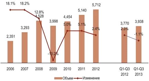 Рис. 2. Объемы строительства в России (млрд. руб.) и их реальное изменение (2006 год - сентябрь 2013 года)
