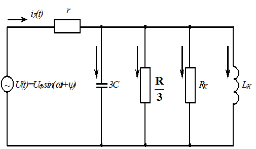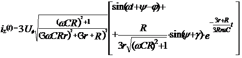 В сетях с изолированной нейтралью повреждение изоляции относительно земли одной из фаз приводит к полному перераспределению напряжений фазных проводов во всей системе и источником изменения является место повреждения. Переходный процесс характеризуется в этом случае стеканием заряда с проводников поврежденной фазы и разряда их до потенциала земли, и переносом дополнительного заряда неповрежденным фазам для сообщения им нового потенциала относительно земли. В соответствии с упрощенной схемой замещения сети, представленной на рис. 2.4, запишем выражения для максимальных значений трех составляющих тока металлического замыкания на землю, создающих ток замыкания в переходном режиме.