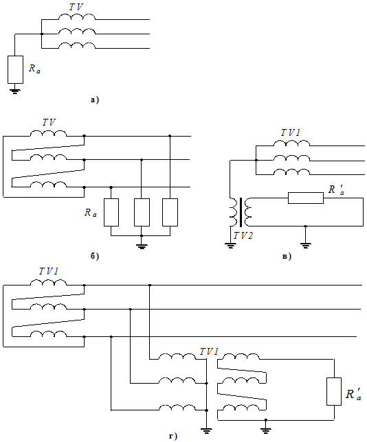 в качестве нагрузочного резистора вторичной обмотки специального однофазного трансформатора, первичная обмотка которого включается между нейтральной точкой сети и землей (рис. 4.1.в);