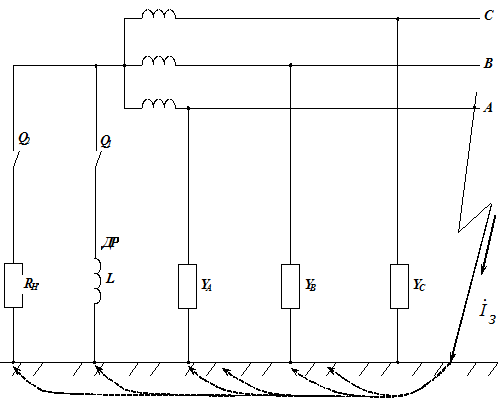 между каждой фазой и землей трех сопротивлений, соединенных в звезду с искусственной нулевой точкой (рис. 4.1.б).