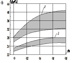 На рис. 4.2 представлена схема, поясняющая принцип реализации комбинированного режима заземления нейтрали сети. Полный аварийный ток при однофазном замыкании на землю складывается из емкостного, индуктивного, активного обусловленного активным сопротивлением изоляции сети и активным через резистор в нейтрали. Векторная диаграмма составляющих токов замыкания на землю для этого случая показана на рис. 4.3а. На рис 4.3б для сравнения показаны зоны максимальной кратности перенапряжений от степени расстройки компенсации от резонансного режима в сети с компенсированной нейтралью (зона 1) и в сети с комбинированным режимом работы нейтрали (зона 2). Верхняя и нижняя границы зон соответствуют значениям коэффициента γ равном соответственно 1 и 0,8, который учитывает физические характеристики сети, относительное место повреждения и прочее.