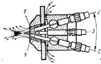 напыляемого материала (проволоки); 3-место подачи сжатого воздуха