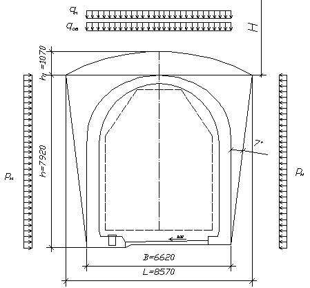 В дальнейшем увеличении толщины обделки нет необходимости, так как при принятых толщинах свода и стен прочность обделки обеспечена.