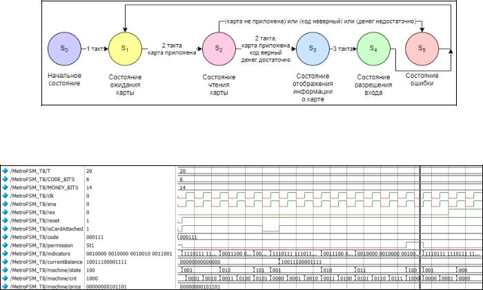 CARD_DISPLAY_STATE ( 3) — состояние отображения информации о карте. Автомат выводит в течение 3 тактов новый баланс карты на индикаторах. После этого переходит в состояние 4.