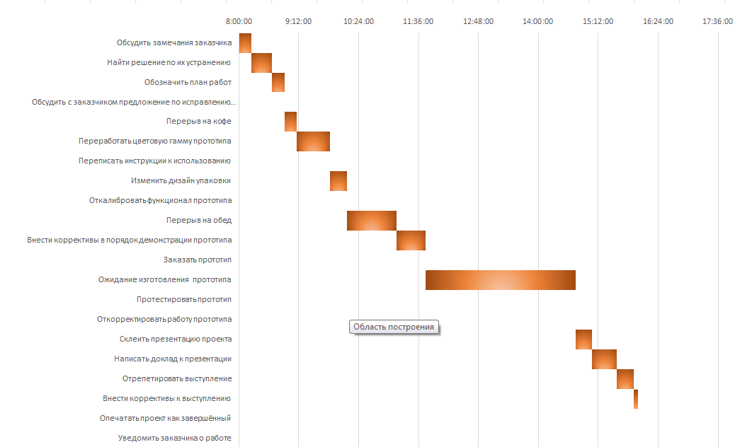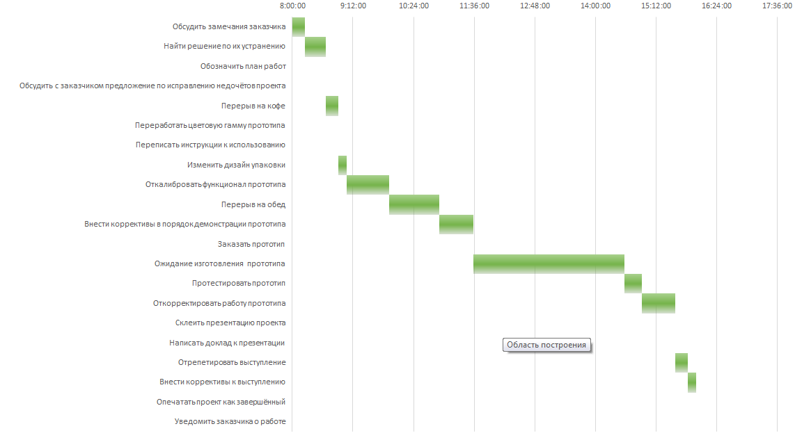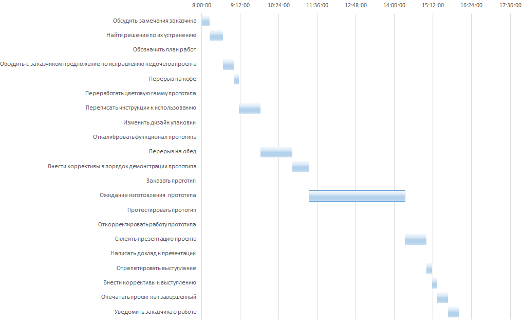 Предположим, что рабочий день в офисе начинается с 8:00, час обеда входит в рабочее время из заданной таблицы, на выполнение проекта выделено 8 рабочих часов, к 16:00 – должен быть готов. Ниже на рисунке 1 показано распределение рабочего времени.