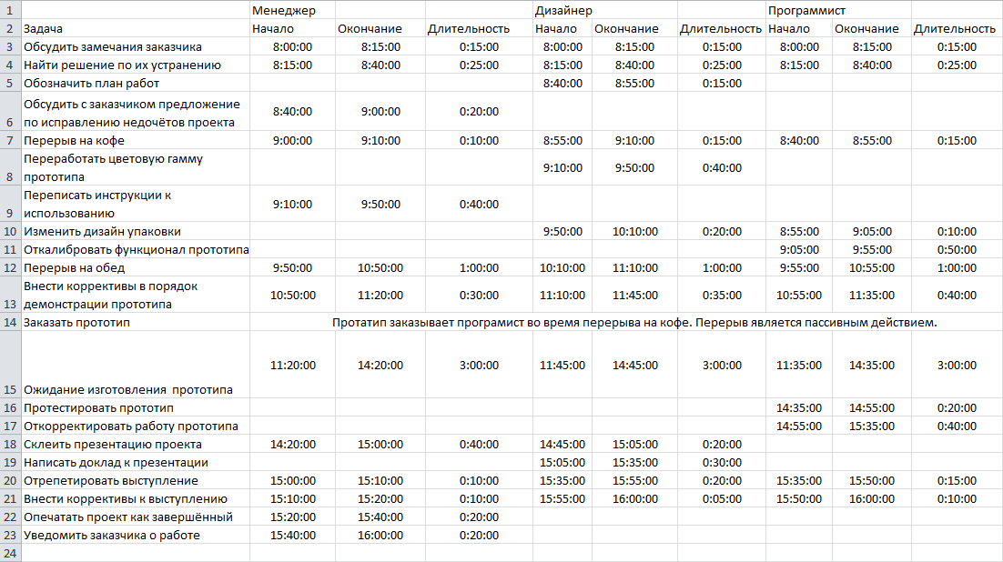 Исходные данные. Над проектом работают три сотрудника (менеджер, дизайнер, программист). Вечером предыдущего дня результаты проекта были переданы заказчику, который, бегло осмотрев его, выслал замечания к качеству исполнения идейной концепции, а также к способу демонстрации. Презентация проекта назначена на будущий день, так что перед командой стоит задача переработать неудовлетворительные для заказчика пункты проекта.