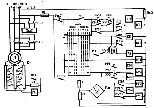 КВ, КН, КТ, КП – контакторы реверсирующие «вперед» и «назад», «тормозной», «пусковой».