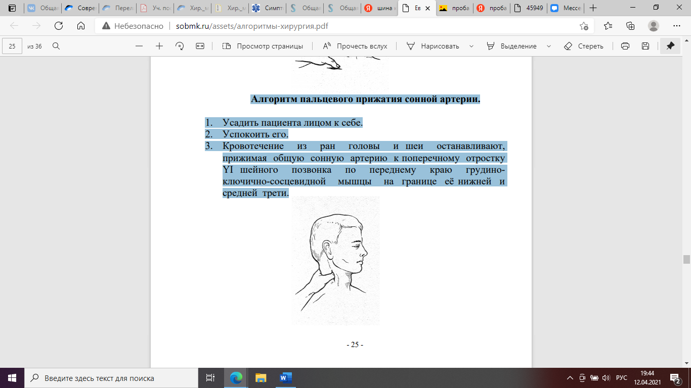 3. Кровотечение из ран головы и шеи останавливают, прижимая общую сонную артерию к поперечному отростку YI шейного позвонка по переднему краю грудиноключично-сосцевидной мышцы на границе её нижней и средней трети.