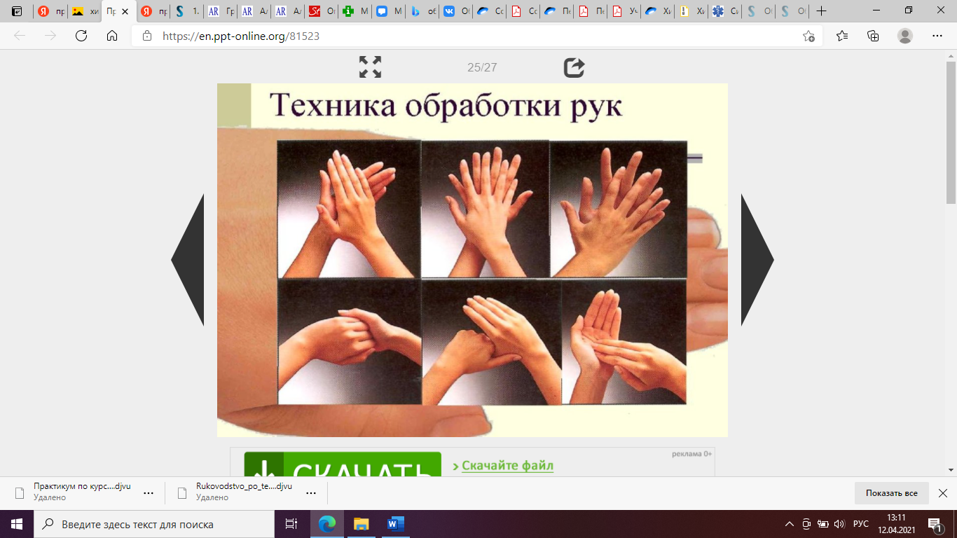 11 После обработки кистей необходимо вымыть предплечья до верхней трети ладонной поверхностью противоположной кисти.