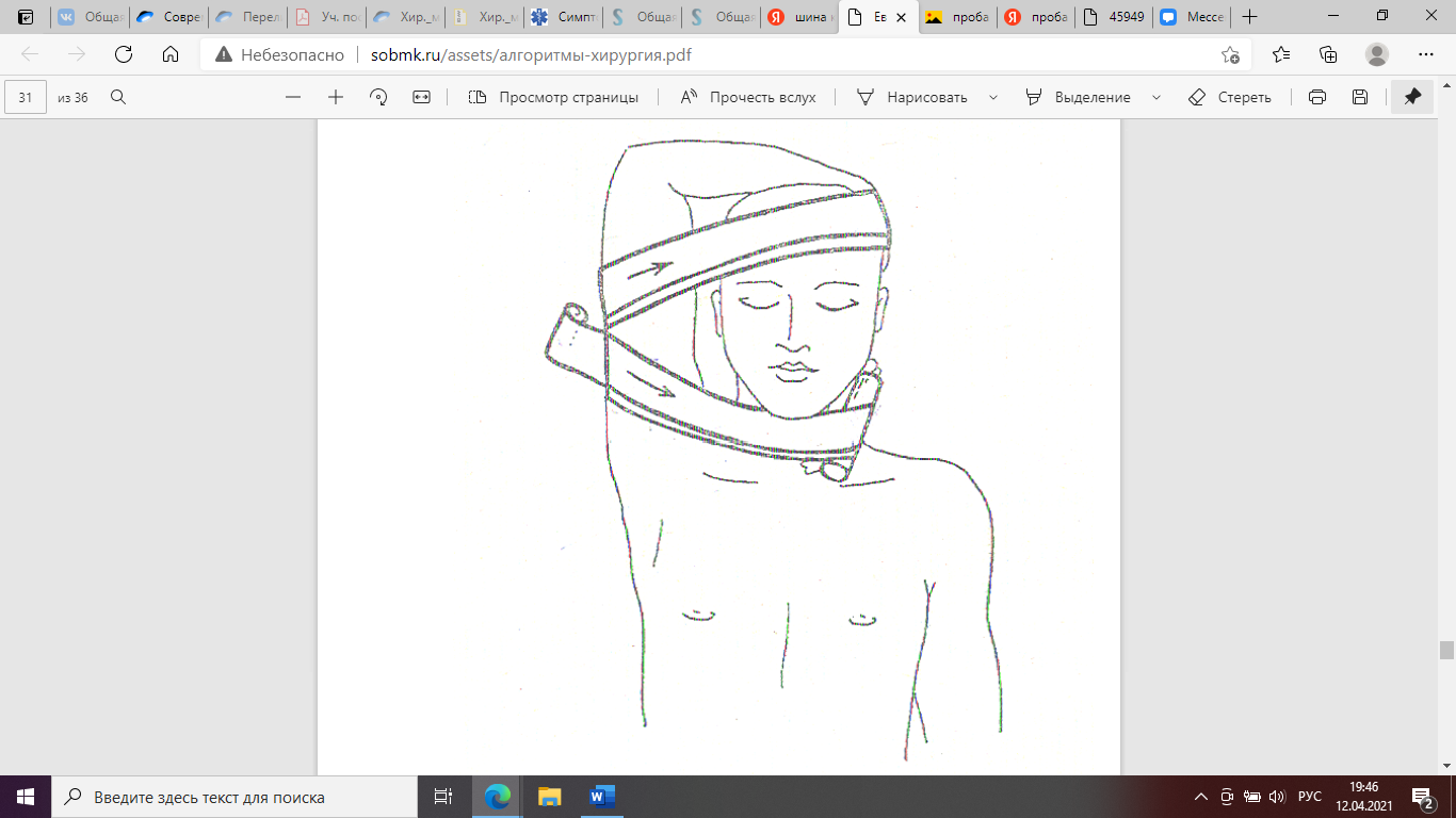 12. При отсутствии шины на голову со здоровой стороны кладут руку и фиксируют жгутом. При этом вместо шины используется плечо.