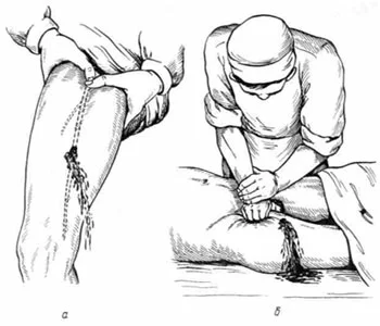 Прижатие артерии на протяжении – кулаком, двумя большими пальцами чуть ниже паховой складки посередине осуществляется давление и прижатие артерии к лонной кости. Жгут. Тугое бинтование. Наложение зажима в ране.