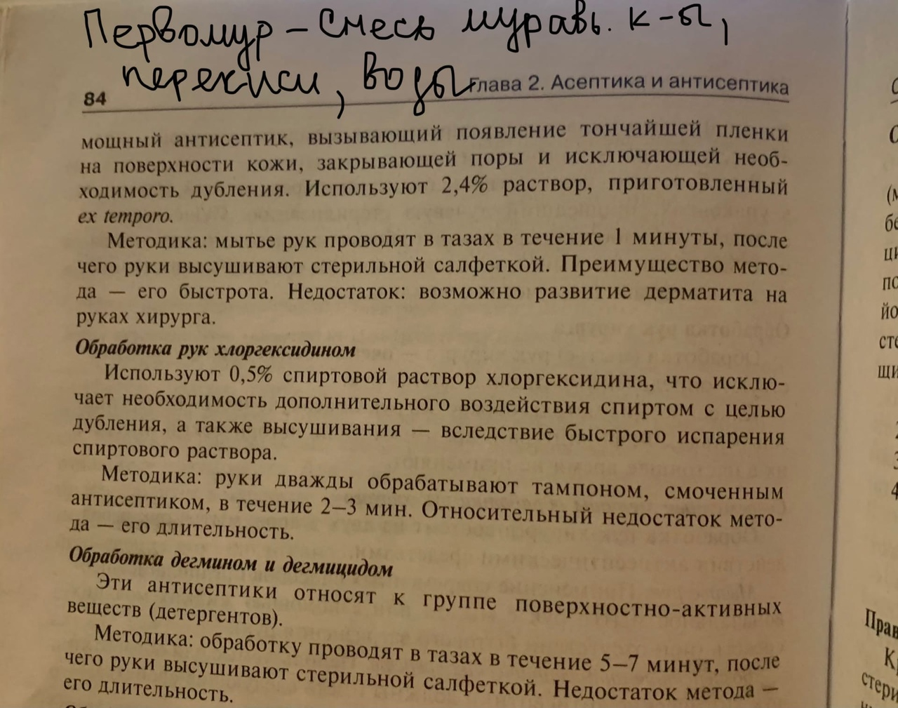 В качестве антисептика для обработки рук можно пользоваться 0,5% спиртовым хлоргексидина биглюконата, 0,5% раствором Пливасепт, Йодопироном.