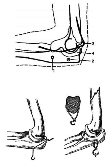 Спицу проводят от верхушки локтевого отростка к основанию. На конце ее делают ступенеобразный упор, после чего спицу протаскивают через кость до упора (без дополнительных разрезов). Вытяжение осуществляют за выступающий из основания локтевого отростка конец спицы.