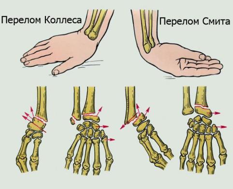 Механизм травмы всегда косвенный – падение с упором на кисть. При этом возникают два вида перелома: разгибательный (перелом Коллеса) и