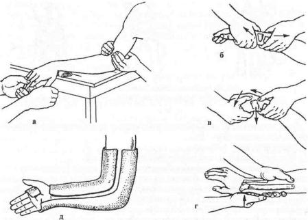Накладывают гипсовую глубокую шину от верхней трети предплечья до головок пястных костей так, чтобы край шины с лучевой стороны заходил до середины предплечья по ладонной поверхности, тщательно модулируют