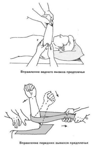 Вправление. Один помощник удерживает плечо, другой производит вытяжение по оси смещенного предплечья. При продолжающемся вытяжении хирург производит давление в противоположные стороны на боковые поверхности мыщелков плеча и верхнюю часть предплечья. При вправлении слышен щелчок. Предплечье переводят в сгибательное положение и в этом положении фиксируют.